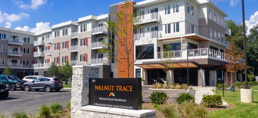 Walnut Trace is a modern senior-living community by National Church Residences, featuring a 4-story, 94,000 sq ft building with 94 independent-living apartments, offering spacious one- and two-bedroom floor plans, contemporary amenities, fitness spaces, a bistro, community rooms, and easy access to nearby trails in Gahanna, OH.